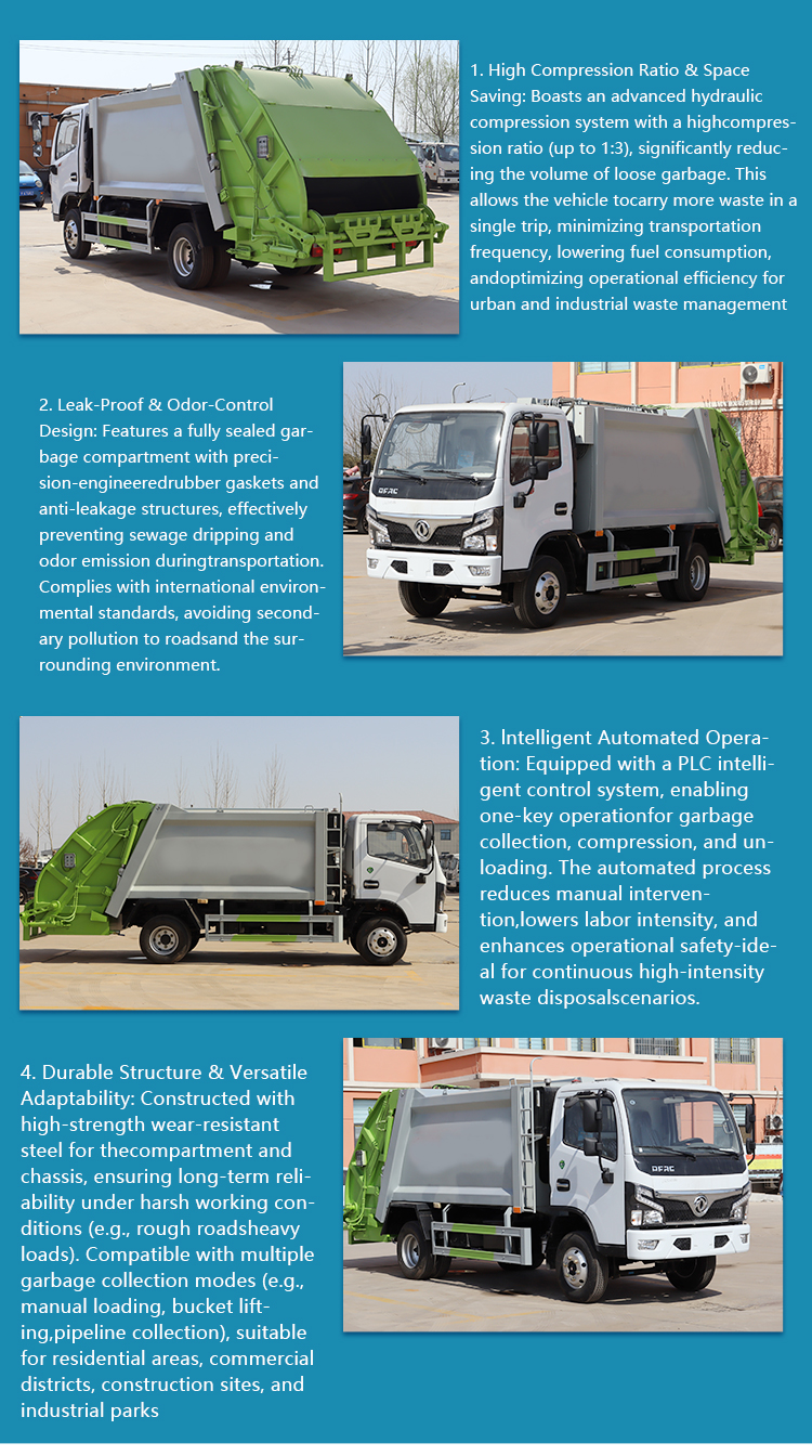这款 5 立方压缩式垃圾车专为高效城市垃圾收集而设计。采用可靠的东风 4×2 底盘,配备手动变速箱和符合国五排放标准的大功率柴油发动机。高强度钢压缩机构通过压缩垃圾最大限度提高装载量,减少前往垃圾处理场的运输次数。该车兼具耐用性与机动性,是市政环卫部门和私人垃圾清运公司运输生活垃圾和商业垃圾的理想解决方案。