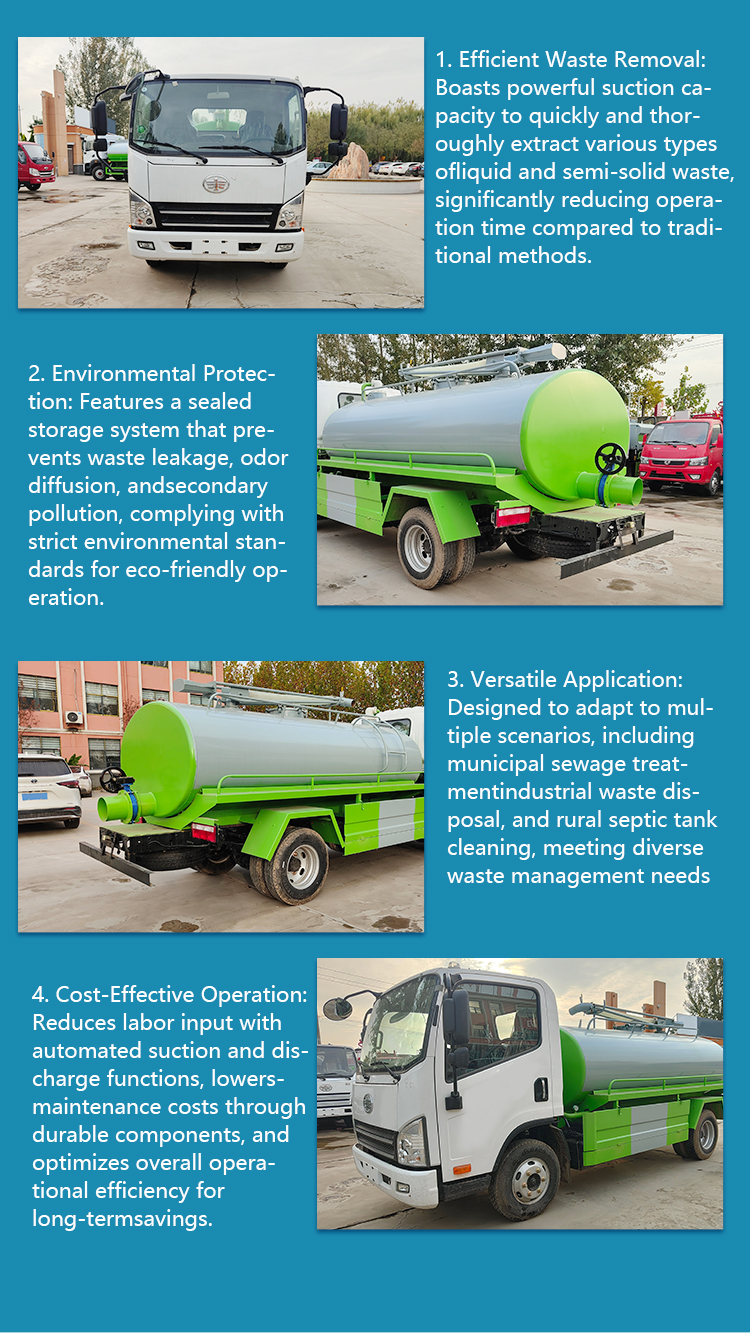 这款大功率真空吸污车专为高效污水及废弃物运输设计。采用手动操作模式,配备耐用的 5 立方米罐体,适用于吸粪、化粪池清理及工业废料收集。搭载强劲柴油发动机,吸力强劲、性能可靠。厂家直销,支持定制,可满足具体作业需求。