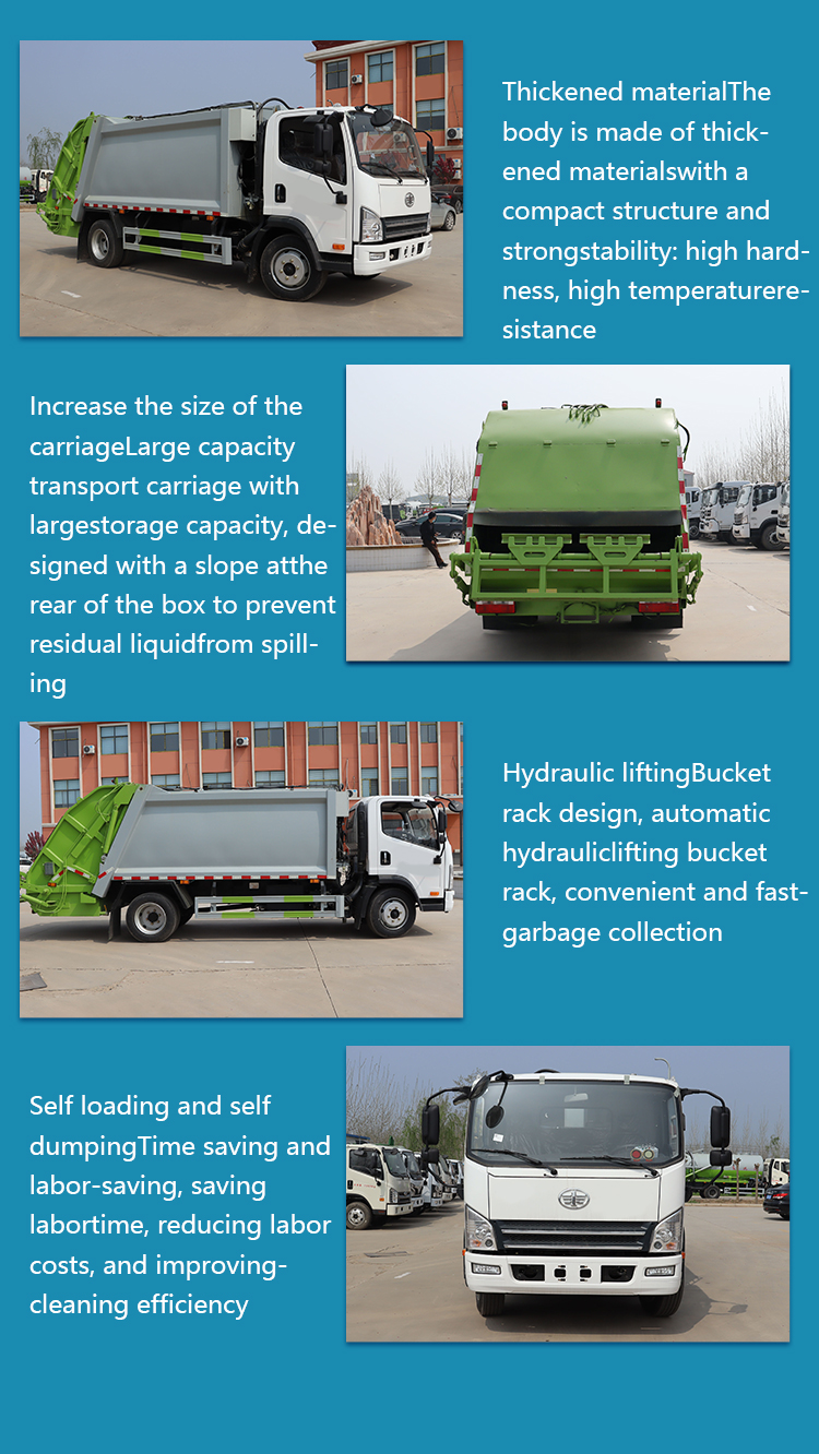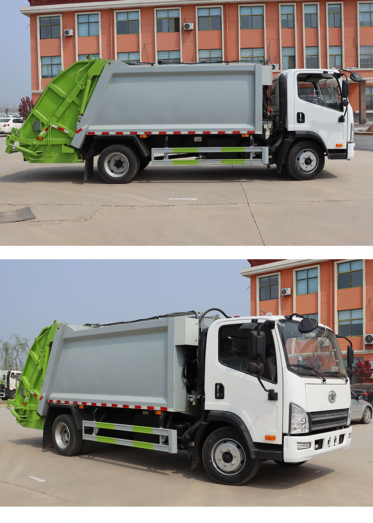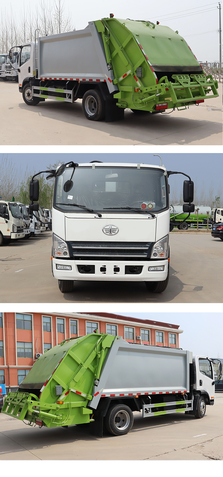 • 一汽解放虎 VH 4×2 手动后装压缩式垃圾车,容积 8-12 立方米,用于高效市政垃圾收集