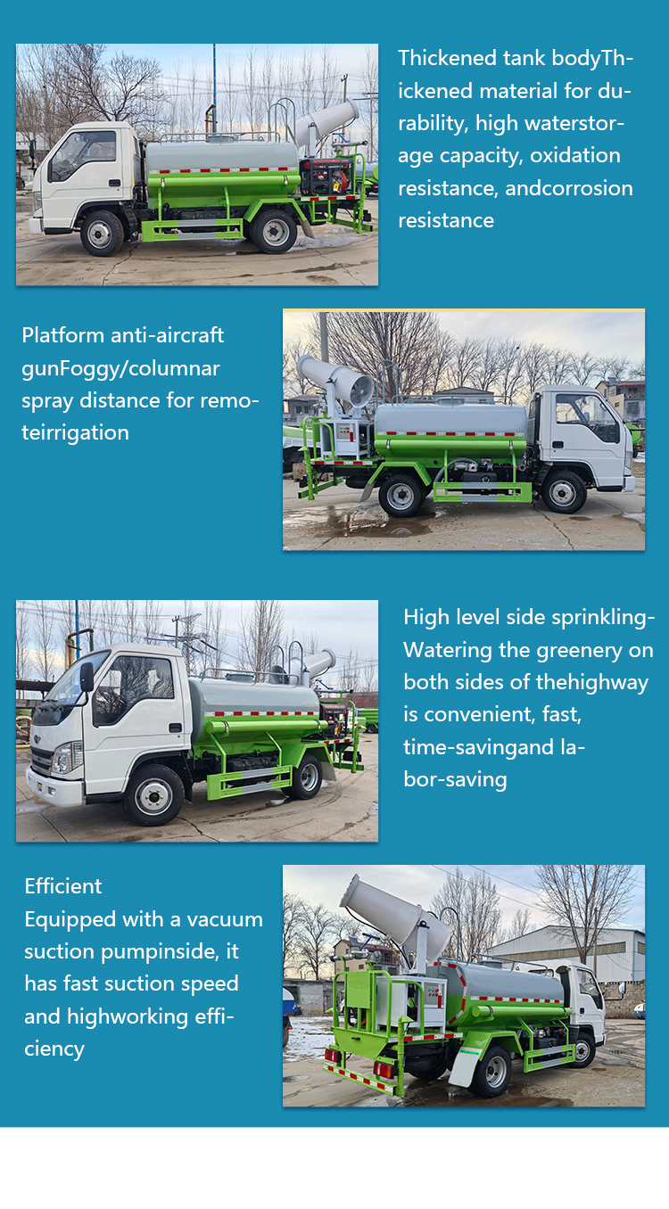 福田小卡之星2多功能抑尘车专为城市道路清扫与粉尘控制作业设计,兼具紧凑灵活的操控性与强劲的抑尘能力。该车搭载可靠柴油发动机,采用4×2底盘,配备高性能水炮及喷雾系统,可有效降低空气中粉尘、清洁路面,改善市政、工业及建筑工地环境的空气质量。其灵活小巧的车身便于在狭窄街道与拥堵区域作业,是城市环卫部门、园林绿化承包商及现场管理人员寻求高效高性价比抑尘设备的理想选择。