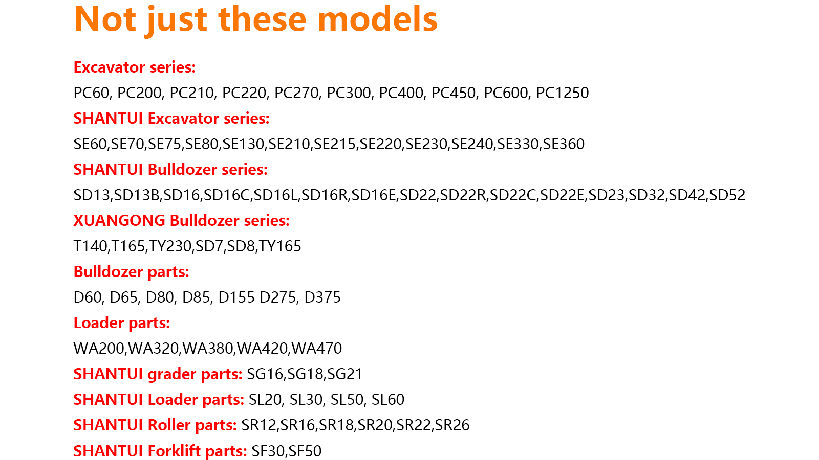 我司专业销售小松、山推全系列工程机械配件,主营推土机、平地机、挖掘机、装载机及自卸车配件。公司坐落于山东省济宁市,依托小松与山推原厂生产基地的区位优势,为客户提供高品质配件与优质服务。我司已开发小松推土机 D31、D41、D51、D65、D85、D155、D275、D375 及平地机 GD511、GD611、GD623、GD655、GD675、GD705 等多款机型配件,在该领域具备绝对优势。竭诚欢迎业内同仁咨询洽谈。