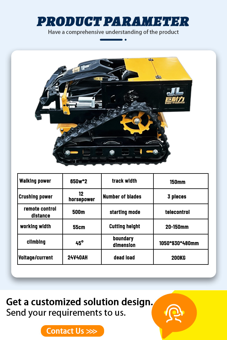 本机为全遥控智能履带式碎草割草设备,采用履带行走越野结构,爬坡能力强,500 米远距离无线遥控操作;可高效边坡除草、杂草粉碎修剪,适配山坡、果园、茶园、荒地、庭院等复杂地形,无人遥控作业安全高效。